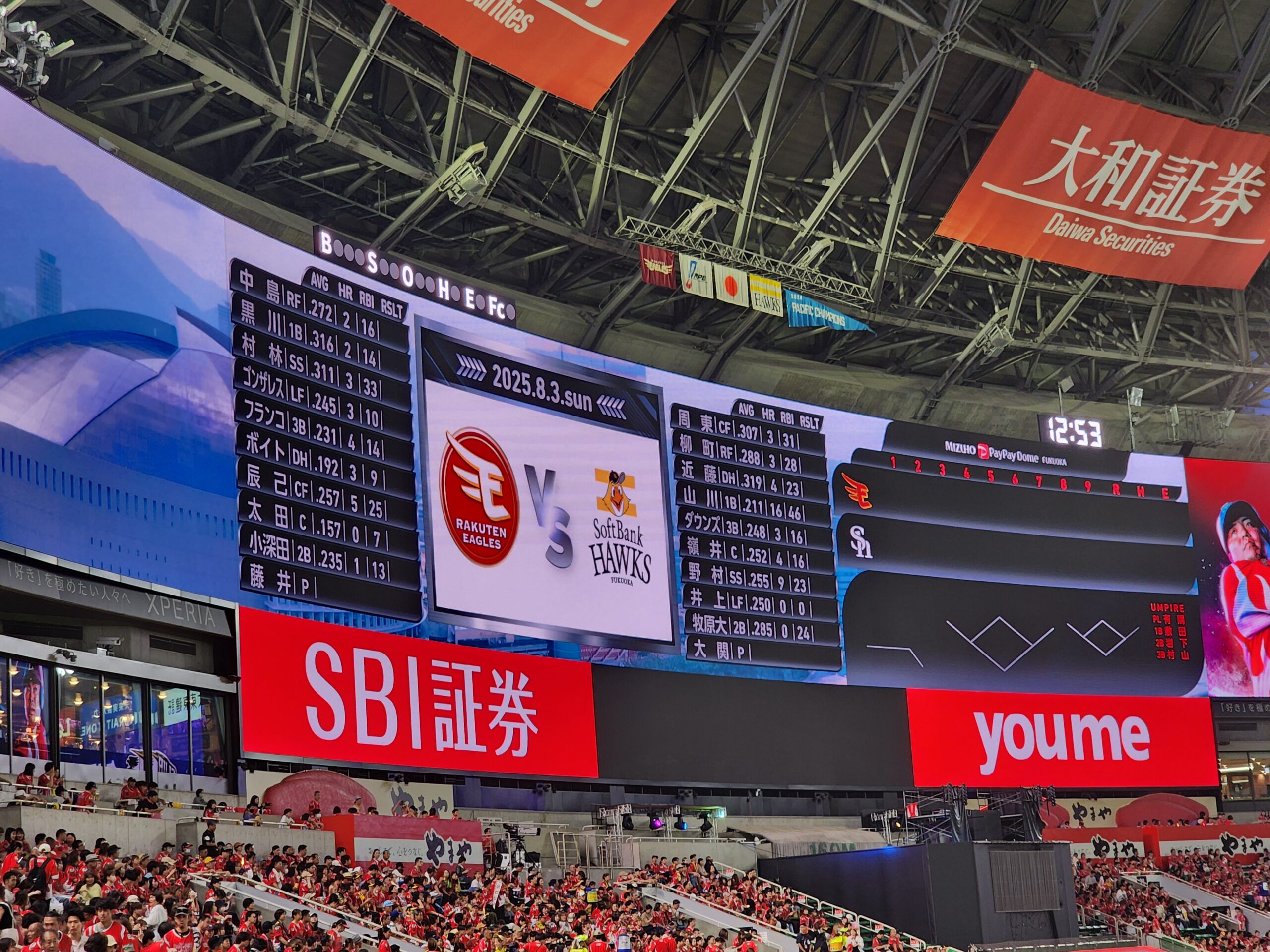 この日はソフトバンクの「鷹祭」開催日ということもあり、球場周辺はお祭りのようなにぎわい。普段とは違う球場で、独特の熱気と盛り上がりを感じることができました。時間の都合で途中までの観戦となりましたが、その時点ですでに楽天は苦しい展開に。